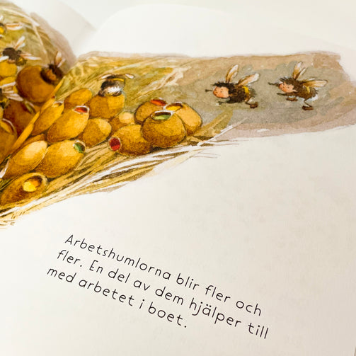 Med mindre text och känsliga illustrationer vävs berättelsen om humledrottningens fantastiska liv fram.