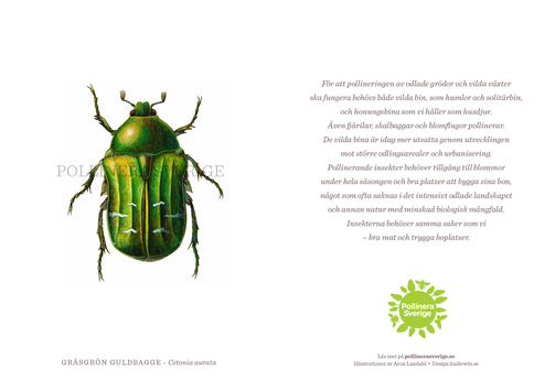 Gräsgrön guldbagge - en av våra viktiga pollinatörer. Baksidan av kortet berättar kort om de pollinerande insekterna.