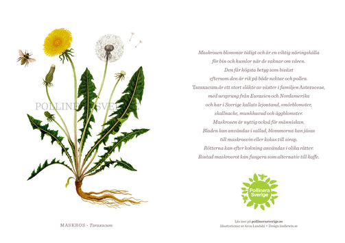 Maskros - en av de många blommor som våra pollinatörer älskar. Baksidan av kortet berättar kort om de pollinerande insekterna.