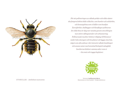 Storullbi - en av våra viktiga pollinatörer. Baksidan av kortet berättar kort om de pollinerande insekterna.