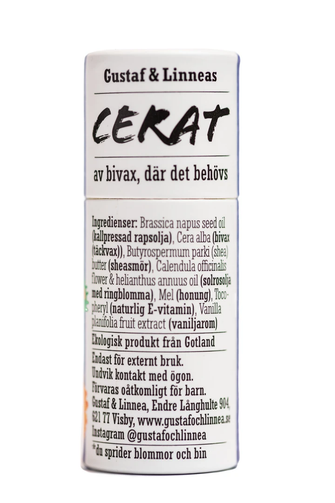Ekologiskt cerat från Gustaf & Linnea, med svenskt bivax och smak av kokos och honung. Ekologiskt och i miljövänlig papphylsa. Extra tjockt stift som lätt kan användas inte bara på läpparna utan även på tex torra händer.