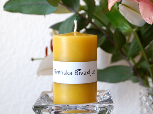 Vackert blockljus av svenskt bivax. Handstöpt på traditionellt vis. Brinner hela 50 timmar med klar, stadig låga. Sotar inte!