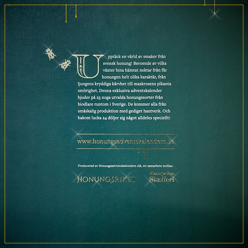 Beroende på vilka växter bina hämtat nektar från får honungen helt olika karaktär, från ljungens kryddiga kärvhet till maskrosens pikanta smörighet. Denna exklusiva adventskalender bjuder på 23 noga utvalda honungssorter från biodlare runtom i Sverige. Samtliga kommer från småskalig produktion med gediget hantverk. Och bakom lucka 24 döljer sig något alldeles speciellt!